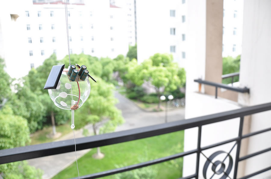 电路组装完成后,将它贴在风铃外壁上,小心调节电路的位置,使整个风铃有一定的倾斜,使得玻璃柱可以靠近电磁铁。然后,在玻璃柱最靠近电磁铁的位置上贴上一小块钕铁硼磁铁。这样,磁铁会在磁场的吸引下撞击外壳,发出响声,而当太阳能引擎电力耗尽时,磁场消失,磁铁摆回原来的位置,等待下一次吸引。