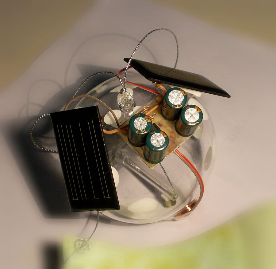 这个风铃就采用的BEAM bot中的倍压式太阳能引擎。当它吸满阳光,便会用风铃外面的线圈吸引风铃的玻璃柱撞击风铃外壳,发出响声。这种电路能真正做到免维护,也不需要为电池的更换和处理花费心思。只要有阳光,它就可以不停地工作下去。