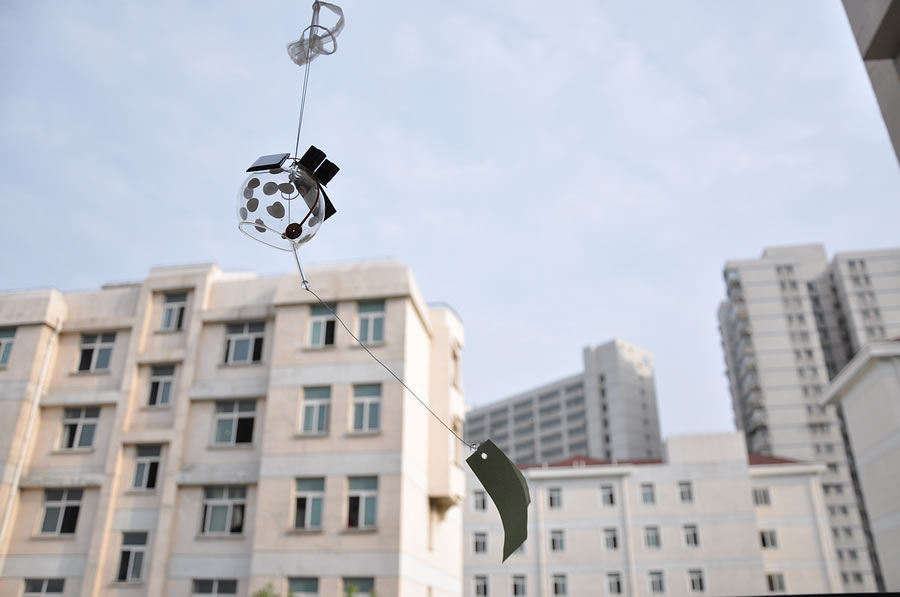 至此,即使无风,在阳光照耀下,电磁铁也会周期性地吸引磁铁撞击外壳,发出响声,让风铃在无风时也能继续演奏。