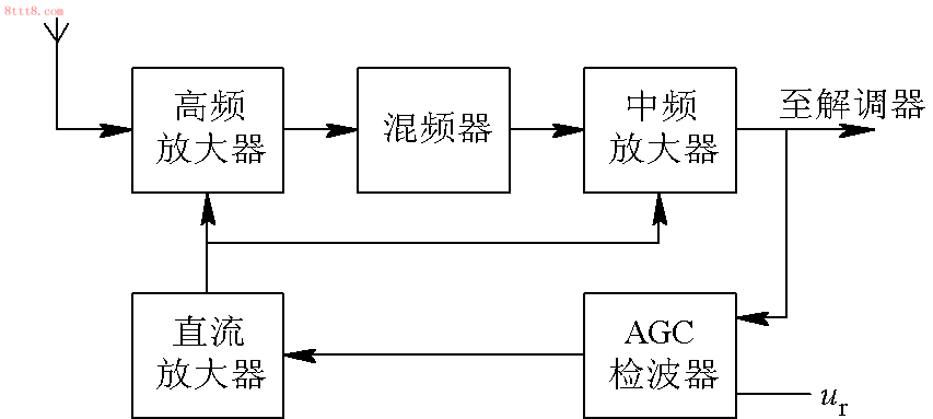 AGC电路的作用是,当输出信号电压变化很大时,保持接收机输出电压几乎不变.图10-25是一个典型的具有AGC的接收机方框图.其中,高频放大器和中频放大器是直接受控的增益可控的放大器.高频放大器和中频放大器是AGC控制环路的对象.检波器,低通滤波器和直流放大器组成反馈控制器.