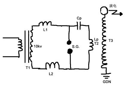 打火器其实相当于一个开关器,未打火时能量由变压器传递到电容阵,当电容阵充电完毕时两极电压达到击穿打火中的缝隙的电压时,打火器打火,此时电容阵与主线圈形成回路,完成L/C振荡进而将能量传递到次极线圈.