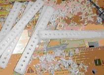 制作提示:当用电钻在塑料材质上打眼时,由于塑料导热能力低,常常使钻头过热,导致钻头退火和打的眼被高温烧变形,所以一定要钻头打眼要沾水。