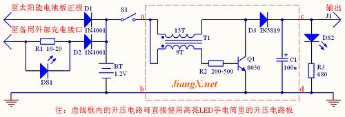 太阳能供电板的电路如图1所示。由D1、BT构成系统的太阳能充电电路。平时,只要达到一定光强,太阳能电池板便通过二极管D1为充电电池BT充电,直至饱和。除了太阳能充电方式外,我还设计了备用的外部直流电源充电接口以防不时之需。外部充电电路由R1、DS1、D2、BT构成,R1选用功率为1W的电阻,当R1为10欧姆的时候,最佳外部充电电压为3-4伏,DS1为外部充电指示灯,它是利用电阻R1上的压降来点亮的。后面的升压电路是运用间歇振荡器的快速关断(截止)的特性而实现升压的。S1为供电开关,当S1闭合后升压电路开始工作,太阳能供电板便可驱动负载,J1为输出接口,DS2是输出指示灯。