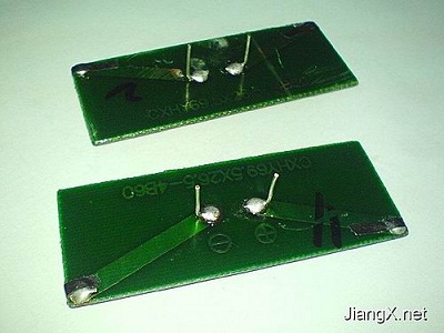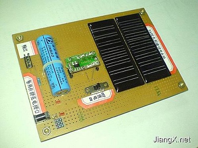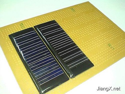 首先剪一小段金属丝焊接在太阳能电池板的两个电极上作为引脚(图3),以便于连接和固定在电路板上。两块太阳能电池板是正极对正极,负极对负极(上面有标识)并联起来使用的,这样可以有效地增强太阳能电池板提供电流的能力。安装好太阳能电池板后如图4所示。