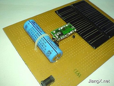 在了解了实际的太阳能电源后,笔者就开始设计太阳能供电板了,我的整体思路是:通过太阳能电池板给1.2V可充电电池充电储能,然后利用升压电路将1.2V升压至3V以上供负载使用。有人可能会说了:为什么不直接用几节充电电池串联来储能和输出呢,这样不就可以省略升压电路了?为什么中间要转这么一道弯呢?因为我们是要用太阳能电池板来给电池充电的,毕竟太阳能电池板产生较高电压的机会不多,电池自身电压过高后会导致充电无法进行。对于我手头的这一种太阳能电池板,在室内靠窗光线比较好的地方输出电压便可达到1.2伏以上(连接在电路中时,非空载状态下),这样就开始给额定电压为1.2V的电池充电了,但如果要使它输出3V以上的电压就恐怕要拿到太阳底下去了。用一节电池储能的好处就是可以大大降低充电对光强的要求,延长给电池充电的时间。