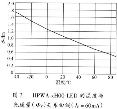 图3是HPWA-xH00 LED的温度与光通量(φV)关系曲线,由图3可知光通量与温度成反比,85℃时的光通量是25℃时的一半,而一40℃时光输出是25℃时的1.8倍。温度的变化对LFD的波长也有一定的影响,因此,良好的散热是LED保持恒定亮度的保证。