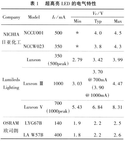 HPWA-xH00是Lumileds Lighting公司的一种超高亮LED,本文以它为例分析超高亮LED的特性。图1为正向压降(VF)和正向电流的(IF)关系曲线,由曲线可知,当正向电压超过某个阈值(约2V),即通常所说的导通电压之后,可近似认为,IF与VF成正比。表1是当前主要超高亮LED的电气特性。由表1可知,当前超高亮LED的最高IF可达1A,而VF通常为3~4V。