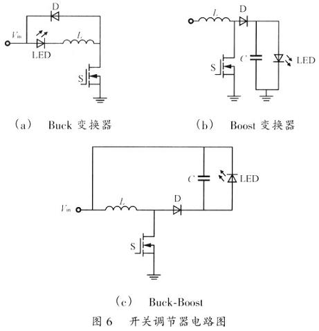 图6(c)为采用Buck—Boost变换器的LED驱动电路。与Buek电路相似,该电路S的源极可以直接接地,从而方便了S的驱动。Boost和 Buck-Boosl变换器虽然比Buck变换器多一个电容,但是,它们都可以提升输出电压的绝对值,因此,在输入电压低,并且需要驱动多个LED时应用较多。