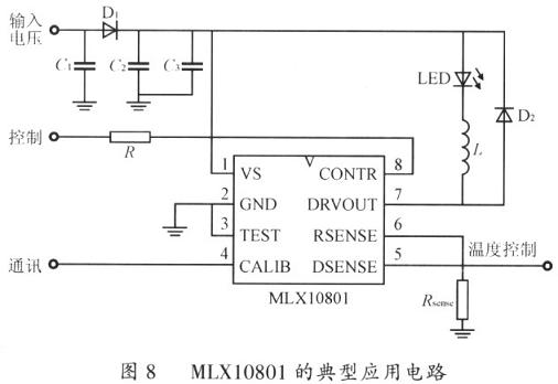 图8为MlJXl0801的典型应用电路,LED、L、D2、Rsense和MLXl0801内集成的MOSFET组成一个典型的Buck 型LED驱动电路。图8中的LED可以根据亮度需要采用多个LEI)串联。MLXl0801通过检测Rsense上的电压来检测通过LED的峰值电流,将该电流值与设定的基准值比较,通过控制脚DRV0UT的脉宽,来控制LED电流的大小。CONTR可以用作外部的开/关控制,或者输入PWM信号来控制 LED闪烁。当不需要控制时,可以将该管脚通过电阻R与脚VS相连。DSENSE用于连接外部的热敏电阻检测LED温度,保护IED。虽然 MLXl0801芯片内部具有内置热敏电阻,但是,为了保证芯片与LED相距较远时仍能够正确检测到温度,MIX10801仍然设置了脚DSENSE来实现远距离温度的检测。脚CALIB用来与控制器通讯,用于接受控制器设定LED的电流、允许最高温度、采用内部温度检测还是外部温度检测、是否防抖、软启动时间等参数。