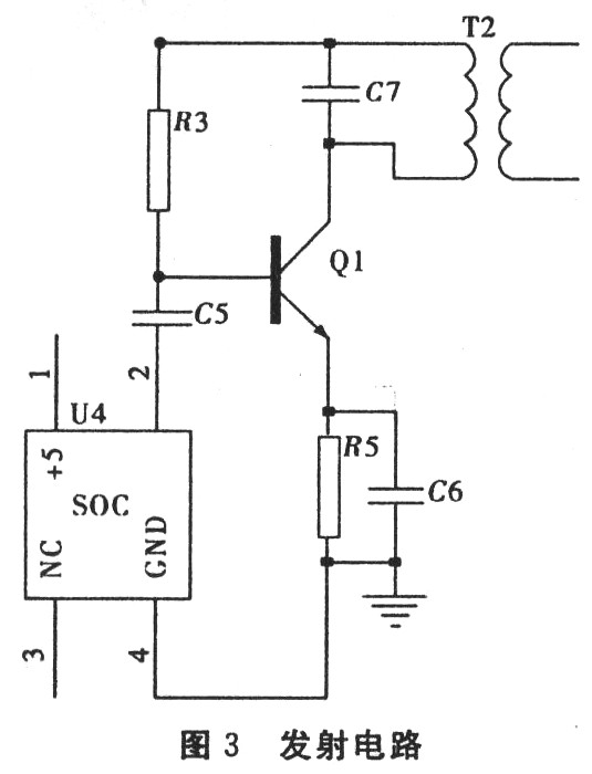 如图3,主振电路采用2 MHz有源晶振作为振荡器。有源晶振输出的方波,经过二阶低通滤波器滤除高次谐波,得到稳定的正弦波输出,经三极管13003及其外围电路组成的丙类放大电路后输出至线圈与电容组成的并联谐振回路辐射出去.为接收部分提供能量。