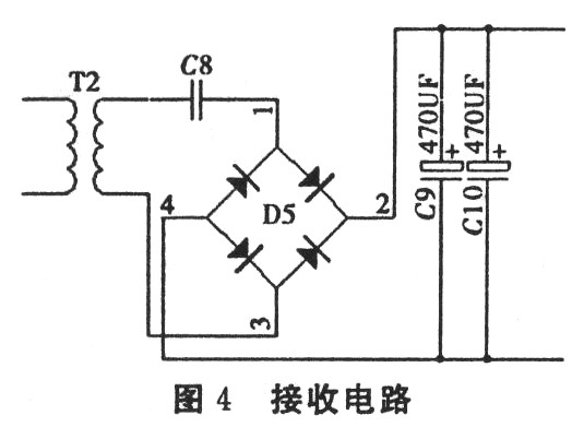 测得与电容组成的并联谐振回路的空芯耦合线圈的线径为O.5 mm,直径为7 cm,电感为47 uH,载波频率为2 MHz。根据并联谐振公式得匹配电容C约为140 pF。因而.发射部分采用2MHz有源晶振产生与谐振频率接近的能源载波频率。
