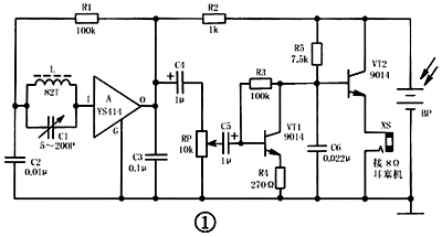 A采用YS414型微型收音机专用集成电路。其主要特点:工作电压低,在1.3~1.5V就能满意正常工作;耗电省,无信号时工作电流仅为0.4mA 左右;工作频带宽,可达150~3000kHz;放大能力强,功率增益可达72dB,自动增益控制范围可达20dB。跟YS414内部电路和功能完全相同、但生产厂家不同的这类集成电路还有:D7642、TA7642、CTC7642、YS7642、BS414、MK-484、2N414型等,它们都可以直接互换使用。