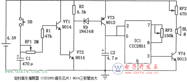 音乐催眠器由定时电路(分立元件1小时定时)和音乐发声电路(CIC2851音乐芯片)两部分组成,具体电路如图所示。9014三极管放大电路的音乐催眠器电路图