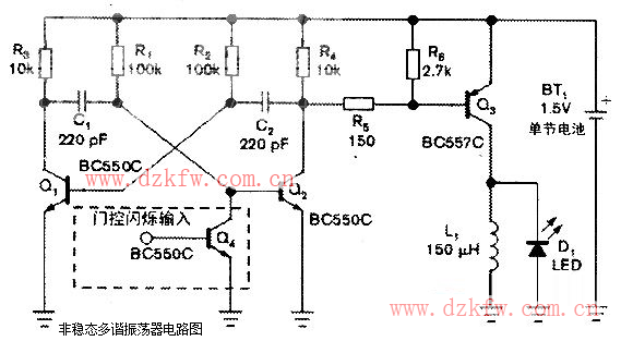 当电池电压为1.5V时.非稳态电路的振荡频率为1/T0.其中:T0=TL+TH,而TL≈0.76R2C2和TH≈0.76R1C1,其中T0是周期时间,TL是导通时间.而TH是截止时间。采用附图中的元件值时,频率与占空比大约分别是28.5kHz和50%。在导通期间.晶体管Q3导通.而电感L1开始以恒定电压充电,因此其电流线性地上升至一个峰值。该值如下式所示:IL1PEAK=[(VBAT-VCESATQ3)/L1]*TL,其中IL1PEAK是L1的峰值电流,VBAT是电池电压,而VCESATQ3是Q3的集电极-射极饱和电压。在截止期间.Q3截止.而电感电压极性反转.使LED正偏,电感以较高的峰值电压通过LED放电.电压大致等于LED的正向电压。