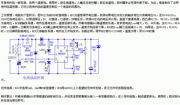 555芯片组成的电热毯温度控制器电路及原理