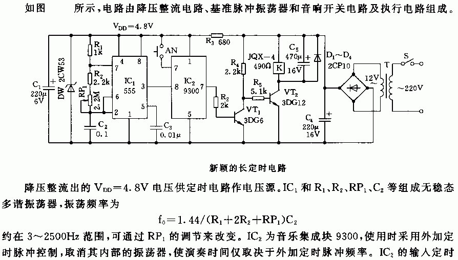 下图是555芯片组成的长定时电路,定时电路由降压整流,基准脉冲振荡器和开关电路及执行电路组成.