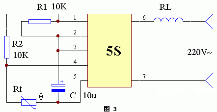 Rt是正温度系数开关型热敏电阻,RL是发热丝。当温度未达到Rt的居里点时,Rt的阻值很小,5S模块的④脚呈低电平,模块内部的电路开通,RL通电工作。一旦温度升高到Rt的居里点时,Rt的阻值阶跃上升,使5S模块的④脚电位陡增,于是模块内部电路被关断,RL停止工作。待温度下降到Rt的居里点以下时,5S模块又开通,RL又通电工作。如此周而复始循环,保持其温度的相对恒定。Rt的居里点可根据应用需要而定。