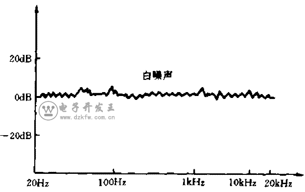 什么是白噪声呢?白噪声是借助色光的颜色来描述声音的一种表述。白色光是由各种颜色的光按一定比例混合而成的。如果用三棱镜来折射白色光,就会得到各种颜色的单色光。白噪声如同白色光一样,也是由多种单一频率的噪声混合而成的,其能量分布是连续和均匀的。图1是白噪声的频谱图,由图可见,它包含了可听到的所有频率的各种噪声。