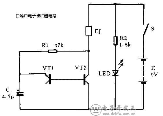 白噪声催眠器的电路如图2所示。接通电源后,电流经过电阻R1向电容C充电,VT1作为稳压管,其内部发生的噪声电流(电子无规则运动所产生)经三极管VT2放大后由耳机BE输出,发出柔和的“咝咝”轻微响声,能催人入眠。