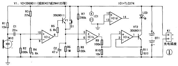 本装置的电路如图1所示。主要由单电源低功耗运算放大器集成电路IC1、二只低功率晶体管、麦克风和高亮度发光二极管所组成。当麦克风MIC接收到一定强度外界声响(包括各种噪声),产生相应强度的输出电压,加到比较器IC1c,当此电压超过比较器门限值,其输出为高电位,使V1导通,它输出电压加到比较器IC1b,同样地,此电压器高于IC1b的门限值,IC1b输出高电位去激励IC1a和V2组成的功率放大器,从而驱动LED发光。预设的延时长短,则由C2和R6,以及R7、R8组成的充放电电路的时间常数决定。