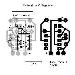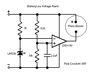 这里介绍的电路主要用于监视用电池供电的设备的电压情况。如航模中,预警电池使用情况,使操作者有时间控制飞机状态,以保证飞机模型能顺利回航。它的电路见下图。图示电路在电压低于4.5V时,开始报警。LM336的上端提供2.5V的参考电压。LM311N为电压比较器。为适应不同电压的监视,可以通过调整8.2k和10k电阻的比值来设置不同的报警电压。