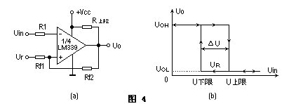 图4a给出了一个迟滞比较器,人们所熟悉的“史密特”电路即是有迟滞的比较器。图4b为迟滞比较器的传输特性。