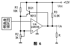 图6为某电磁炉电路中电网过电压检测电路部分。电网电压正常时,1/4LM339的U4<2.8V,U5=2.8V,输出开路,过电压保护电路不工作,作为正反馈的射极跟随器BG1是导通的。当电网电压大于242V时,U4>2.8V,比较器翻转,输出为0V,BG1截止,U5的电压就完全决定于R1与R2的分压值,为2.7V,促使U4更大于U5,这就使翻转后的状态极为稳定,避免了过压点附近由于电网电压很小的波动而引起的不稳定的现象。由于制造了一定的回差(迟滞),在过电压保护后,电网电压要降到242-5=237V时,U4<U3,电磁炉才又开始工作。这正是我们所期望的。