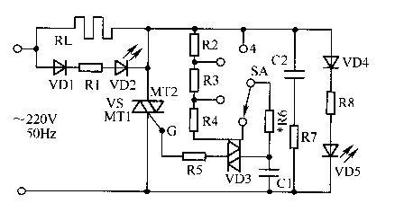 电路原理图如图1所示。调节波段开关SA的挡位,可以改变电容C1的充放电速率。利用C1两端交流电压通过双向触发二极管VD3去触发双向晶闸管VS导通、并改变了VS的导通角,使负载RL两端交流电压随之发生变化。