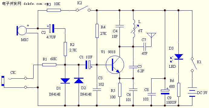 CK是外部信号输出插座,可以将电视机耳机插座或者随身听耳机插座等外部声音信号源通过专用的连接线引入调频发射机,外部声音信号通过R1衰减和D1、D2限幅后送到三极管基极进行频率调制。