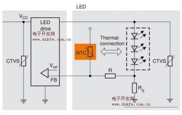 如果LED电路安装了SMDNTC热敏电阻,最佳工作温度的每一次变化都会引起NTC部件阻值的显著变化。经过比较器评估,流经LED的电流会随即减少,LED的功率损耗也会随之降低,进而延长使用寿命。下图展示了相应的电路。我们提供配备爱普科斯(EPCOS)SMDNTC热敏电阻的样品工具包,专供LED照明系统开发人员使用。