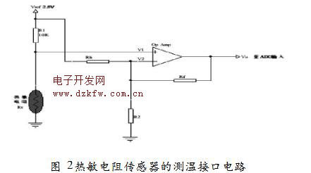 如图2为热敏电阻传感器运用同相放大电路进行温度测量的接口电路,该接口电路利用电阻器对热敏电阻传感器进行线性化,接口电路有电压模式和电阻模式。二者的作用都是实现线性化。图2用固定电阻器R1就可以实现线性化,称为电压模式。