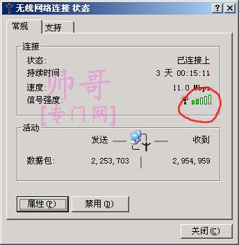 这个是原来隔了三堵墙后,帅哥的802.11a/b/g网卡接收到的TPlink ap信号强度。这个时候虽然还显示连接速度为11M,但实际上只能以非常慢的速度访问网页,要想点播局域网内另一台电脑上的DVDRip电影是绝对播不出来的。