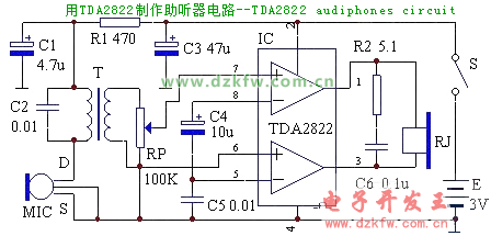 该助听器电原理图见图1。其工作原理较简单:驻极体话筒连接成高增益的漏极输出电路,并将外界声波转换成电信号。TDA2822组成BTL功放电路,对话筒输出的音频信号进行放大,并以足够的功率推动耳机发声。为了减小耦合引起的损耗,采用变压器耦合,初级加接C2,可以滤除一部分感应噪音,次级与RP连接,以控制音量大小。另R1、C1组成去耦电路,以防止信号通过电源引起反馈;R2、C6为BTL电路的频率补偿。