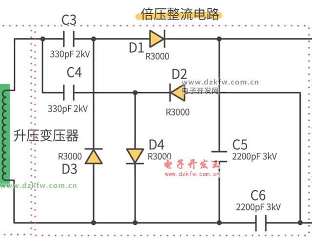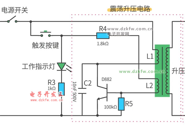 三极管的基极偏置电压会重现像这样导通——截止一直循环就实现了升压变压器次级的输出的电压高达几百伏