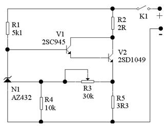 将电源按图示极性接入该电路,此时N1呈截止状态,V1迅速导通,并使V2也导通,电流经R2、V2的C极、V2的E极、R5返回到电源负极。随着电流迅速增大,R5上的电压也越来越高,当R5两端的电压在R3、R4上的分压值达到1.25V时,N1导通,使V1基极的电压下降,V1、V2的基极电流都减小,流过V2的C极电流也随之减小,并保持恒定,使N1的R端保持在1.25V,而一旦电流变大或变小,会使N1的R端电压偏离1.25V,此时N1的导通状态就会改变,并控制V1与V2的基极电流,从而使V2的C极电流在R5上的压降保持恒定,成为一个非常稳定的恒流电子负载。