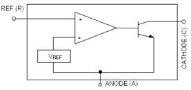 图中的 N1 为三端可调精密稳压二极管AZ432,其特性类似于TL431,只是它的基准电压为1.25V,而TL431为2.5V ,它的等效电路如下图。当AZ432的R输入端电压大于1.25V的基准电压时,等效电路图中的运放输出电压变高,使NPN三极管由截止向导通转变,反之,当R端电压小于1.25V时,该三极管由导通向截止转变,使之达到调整的目的。