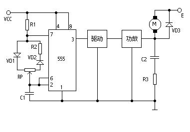 这是一个占空比可调的脉冲振荡器。电机M是用它的输出脉冲驱动的,脉冲占空比越大,电机电驱电流就越小,转速减慢;脉冲占空比越小,电机电驱电流就越大,转速加快。因此调节电位器RP的数值可以调整电机的速度。如电极电驱电流不大于200mA时,可用CB555直接驱动;如电流大于200mA,应增加驱动级和功放级。