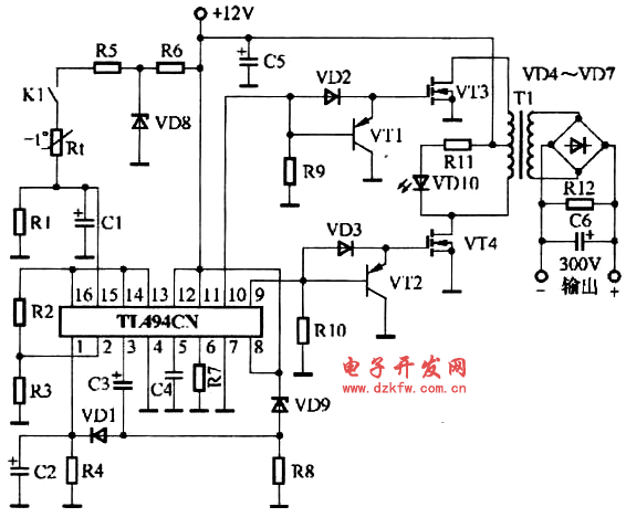 电路如图1所示。该电路核心器件是脉宽调制控制芯片TL494CN,它是— 个开关振荡和稳压控制的集成电路。其9脚、10脚输出相位相反的开关脉冲。分别控制VT1~VT4。当10脚为正脉冲时,VT1截止、VT3导通,VT2导通、VT4截止。9脚为正脉冲时,VT2截止、VT4导通。在变压器的次级产生了被升高的高频电压,再经桥式整流、滤波变成约300V的直流高压输出。集成电路TL494CN的1脚、16脚和2脚、15脚分别是该集成电路内部两个比较器的同相输入端和反相输入端。利用这两个比较器实现该电路的超温保护和过压保护。