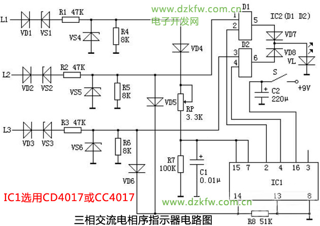 当相线L1电压处于有效状态、ICl的15脚(R端)有方波信号输人时,ICl内电路清零复位,其3脚(Y0端)输出高电平,而2脚(Y1端)和4脚(Y2端)输出低电平,此时若相线愧和L3相序正确,则相线U电压处于有效状态。VD5正端由方波信号时,ICl计人一个计数脉冲,其2脚输出高电平,使Dl输出高电平,D2输出低电平,VD7导通,VL点亮。同理,在相线L3电压处于有效状态、VD6正端由方波信号时,IC1又计人一个计数脉冲,使4脚输出高电平,使D2输出高电平,D1输出低电平,VD8导通、VD7截止,VL点亮。
