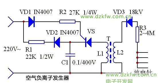 220V市电经VD1、VD2和R1、R2的整流、限流,单向脉动电流控制VS的通断,产生振荡,经变压器T升压后,经VD3整流得到万伏左右的负高压,经放电针对空气放电,产生电离,生成负离子。