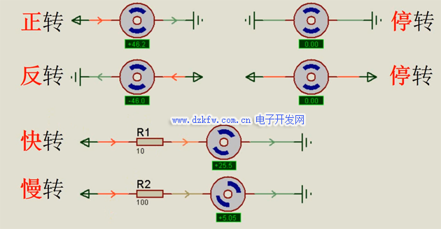 对于普通的直流(有刷)电机,在其两个电极上接上合适的直流电源后,电机就可以满速转动,电源反接后,电机就反向转动。实际情况是我们要能控制电机的正反转,停止等状态以及电机的转速。
