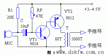 话筒MIC选用普通驻极体电容话筒,T采用便携式收音机输出变压器铁芯绕制,初级用Φ0.15mm漆包线绕80匝,次级用Φ0.08mm漆包线绕5000匝。RP为47k带开关的电位器。电源采用二节5号电池。电极用厚0.5-1mm左右的铜片焊上两根细绝缘导线,并将铜片弯成指环套在不相邻的两手指上。