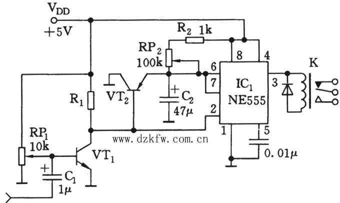 如图所示,该电路由声音检测电路和单稳触发电路组成,执行元件为继电器。VT1完成输入音频信号的放大,当有信号来时,使555置位,K吸合。同时,VT2导通,C2上的电荷通过555内部的放电管和VT2迅即放完。声音过后,VT1、VT2截止,C2通过R2、RP2对其充电,单稳态电路的暂稳时间td=l.1(R2+RP2)C2,延时范围在0.05~0.5秒,可通过RP2来调节。