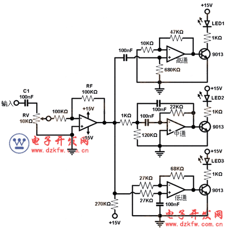一简单的声光转换器电路图(如音频信号来自一个CD播放机扬声器输出信号)。该电路由一个缓冲/放大级和3个滤波器电路:一个高通滤波器,中通滤波器和低通滤波器。每个滤波器输出驱动电路的不同颜色的LED(发光二极管)。从而实现声光转换。