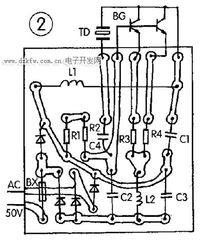 R1、R2功率应大于1W。L1用长6.5cm,外径2cm的塑料圆管作骨架,在上面用直径0.74mm漆包线绕70匝。L2不用骨架,用0.8mm漆包线在直径0.8cm圆棒上绕6.5匝,脱下圆棒使线圈伸长至1cm即可。电源变压器功率大于35W。印刷板图见图2。