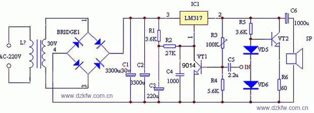三端稳压IC选取LM317,三极管VT1选取9014。VT2选用8050型,二极管VD5、VD6选用2CP20,变压器的功率应大于50W。