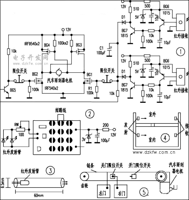 图1是红外接收和电机驱动电路,在无人的时候红外接收器正常接收来自另一侧发过来的红外光束。用60mm长刚好插入红外发射管的导向管(图3)在墙壁上平行固定,高度适当,并和对面的接收器对准,这样发出的红外线是一束,不易干扰另一个接收器。具体安装方法见图4所示。经BG6、BG7、CR等放大滤波后输出低电平,此时BG5截止,BG2、BG3导通执行关门动作。当人走到门口时,红外光被挡住,BG7输出高电平经一路限位开关驱动BG1、BG4执行开门动作,另一路经R1驱动BG5使BG2关断,当门开到指定位置时开门限位开关断开,使电机不再继续运转。当人离开时,BG7不再输出高电平,经电容C1延时三秒钟后执行关门动作。