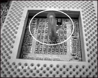 1. 热敏电阻一只。电路中的热敏电阻必须选用负温度系数热敏电阻MFB52-103 ,它在0~100℃时具有很好的线性,而且常温阻值较大(10K),阻值随温度变化有很大变化!这一点是本电路实用性的重要保证!。另外,值得一提的是本人经实验发现,在旧主板中比效常见的一种的CPU温度探测头用在本制作中相当的合适。如图2,CPU插座中央或者SLOT插座旁边常见的这种薄片式的热敏电阻,其常温阻值正好是10千欧而且又薄又小,安装在显卡的散热片上很合适!所以,如果你购买热敏电阻困难的话,电脑城的维修摊点是个好去处!
