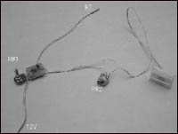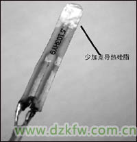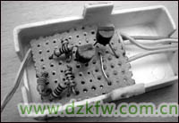 将三极管先焊接在电路板上,然后将外围电阻焊接上,注意,三极管的三个引脚不可搞错。两个电位器不焊接在电路板上,将它们用导线搭焊在线路上。将热敏电阻的引脚理顺,用较长的细软皮线焊接引长(如图5)。