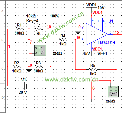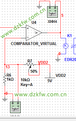 由放大之后的电压送到比较器的正端,由于要设定30℃为报警电路响,30℃时的热敏电阻的阻值约为8.5KΩ,移动RT到8.5KΩ,观察电压表2的读数,同时调节R7,使得电压表3的读数与2的相同